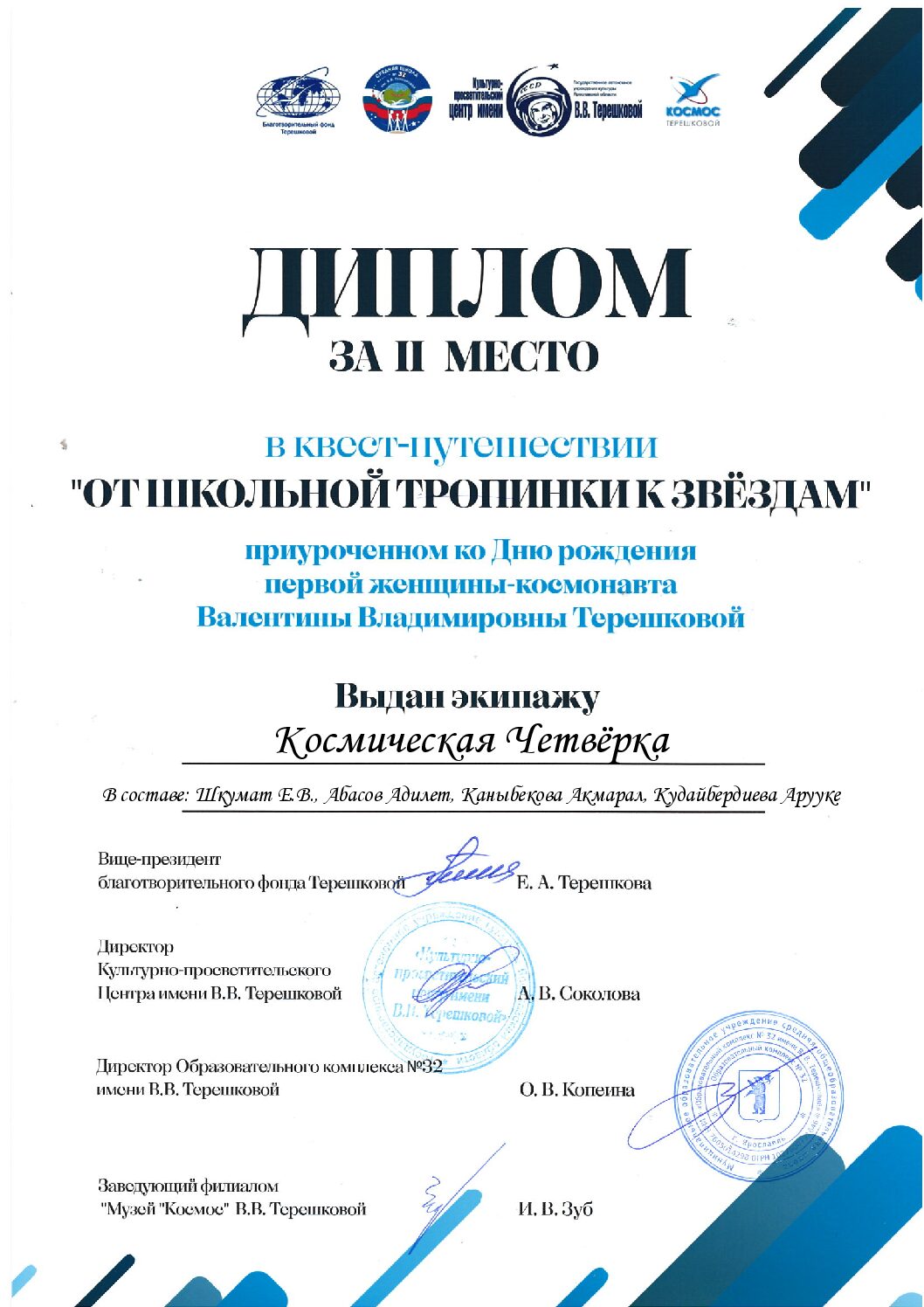 3 марта 2026 г наша команда «Космическая/Звездная четверка» в составе Шкумат Е.В, зам.директора по ВР, учеников 9А класса Абасова Адилета, Каныбековой Акмарал, Кудайбердиевой Арууке приняла участие Международном квест-путешествии «От школьной тропинки к звездам». Организаторы квеста – Образовательный комплекс №32 г.Ярославль (наша школа побратим)