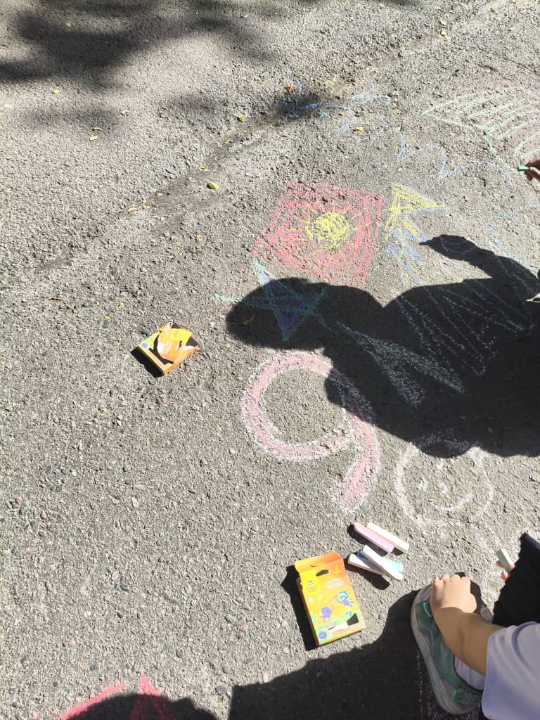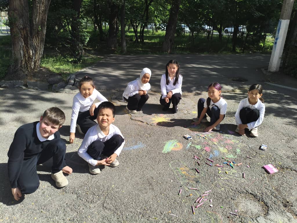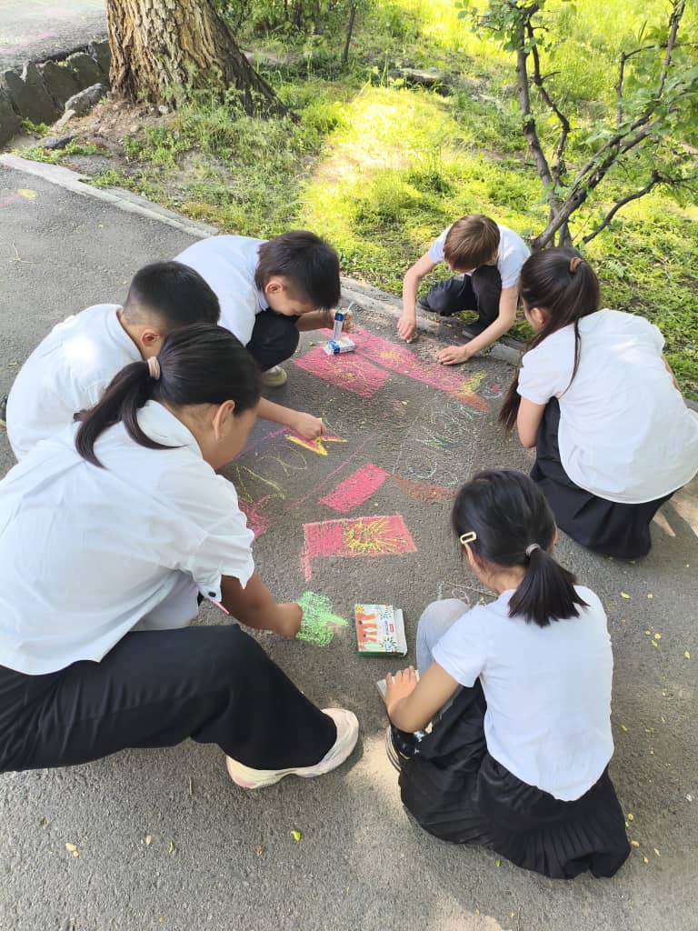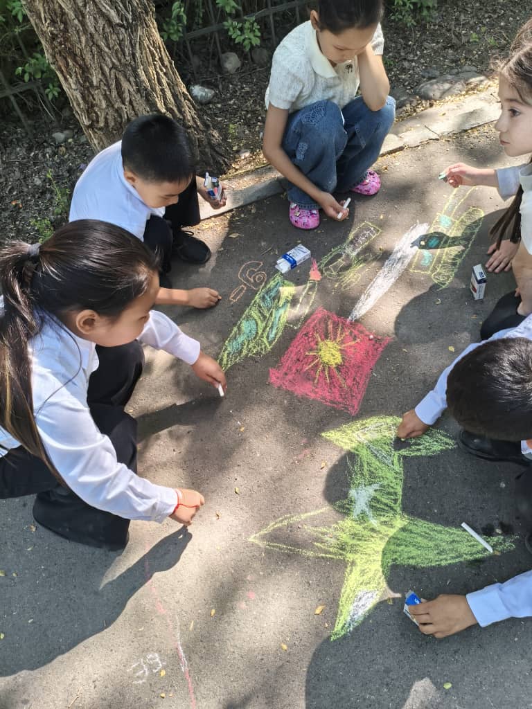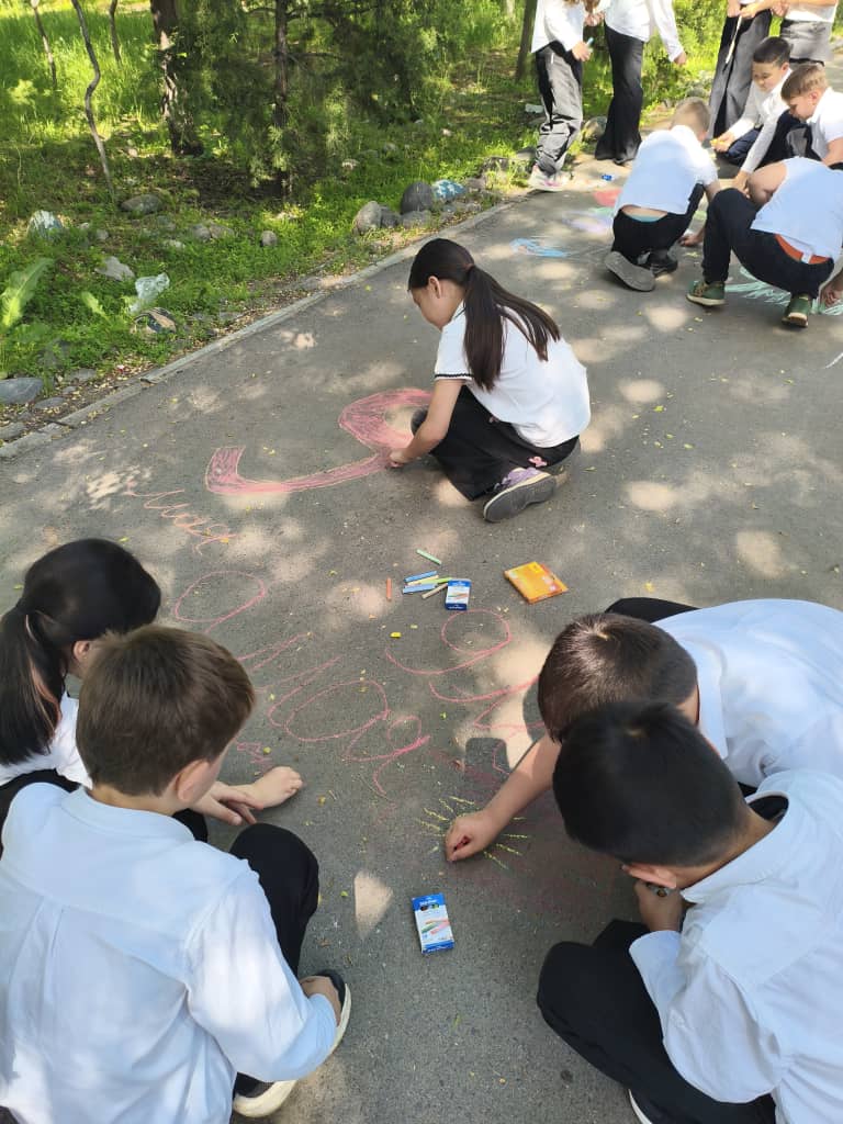 - Самые маленькие художники (1–2 классы): Школьная территория превратилась в яркое полотно. В рамках конкурса «Рисунок на асфальте» ребята создали трогательные картины на темы «Мирное небо» и «Спасибо за Победу».