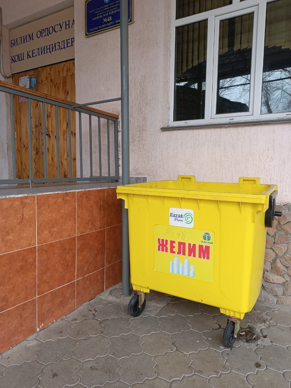 У входа в школу установлен контейнер для сбора пластиковых бутылок.