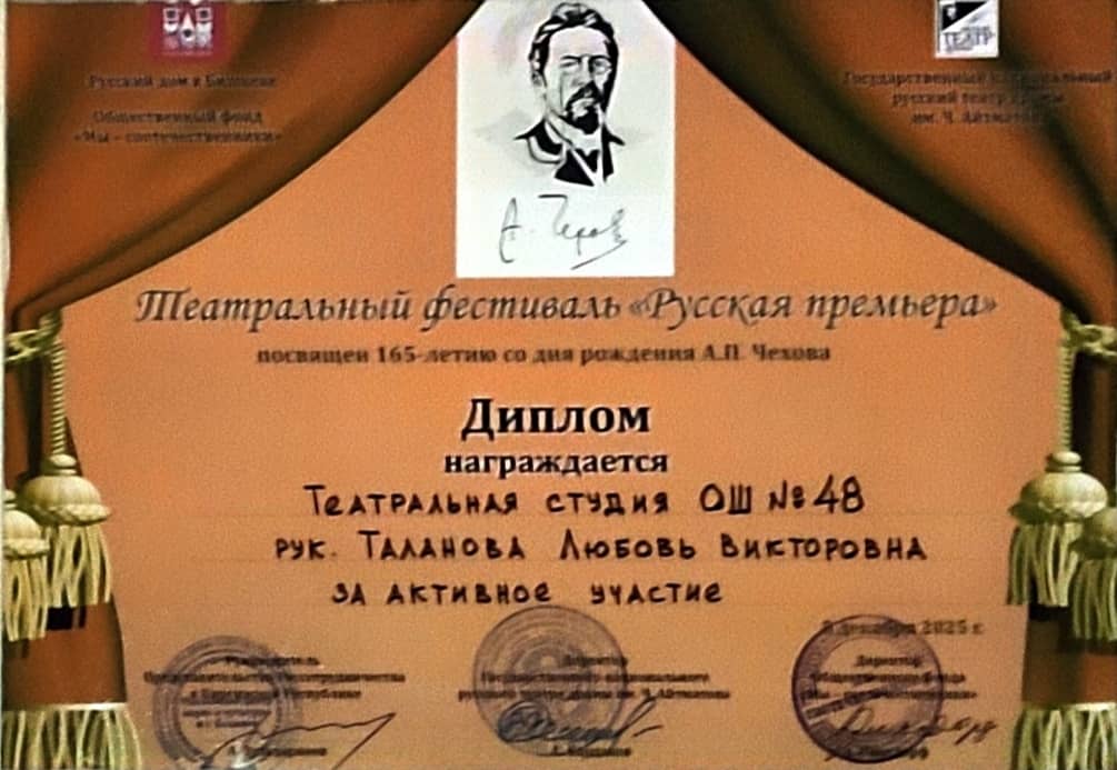 5 декабря 2025 года в Бишкеке состоялся XVI театральный фестиваль «Русская премьера», посвященный 165-летию со дня рождения А.П.Чехова. Организованный фондом «Мы — соотечественники», Русским домом в Бишкеке и Государственным национальным русским театром драмы им. Ч.Айтматова. С утра и до самого вечера 14 театральных коллективов из Бишкека, Канта, Оша, Каинды, Токмока и с. Гроздь Чуйской области демонстрировали свои таланты. На суд зрителей и компетентного жюри спектакль «Лошадиная фамилия» по одноимённому произведению А.П.Чехова представила наша Театральная студия под руководством Л.В.Талановой.