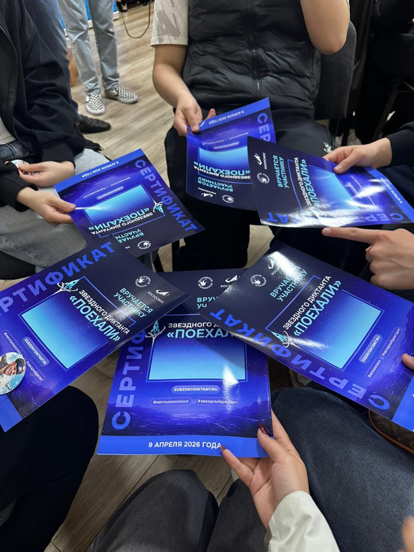 Наши восьмиклассники показали отличную подготовку и эрудицию, уверенно отвечая на вопросы квиза. В завершение праздника каждый участник был отмечен памятными подарками: значком с портретом Юрия Гагарина и сертификатом участника звездного диктанта «Поехали»